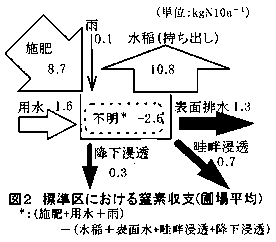 (3)降下浸透および畦畔浸透による窒素流出量は、それぞれ10a当たり0.1〜0.8、0.3〜1.0㎏N(施用窒素量のそれぞれ1〜8、4〜11%)で、それらの窒素収支に占める割合は無視し得ないものであった(図2)。