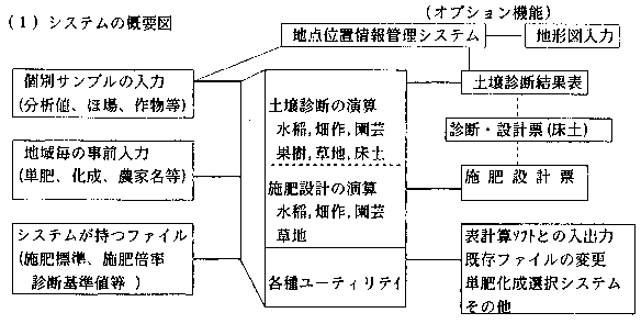 5)システムが持つファイル(施肥標準、施肥倍率、診断基準値、地帯区分等)の大部分は利用者が変更可能とした。また地域毎の事前人力ファイル(単肥、化成、農家名、地区名等)は原則として利用者が入力する必要がある。