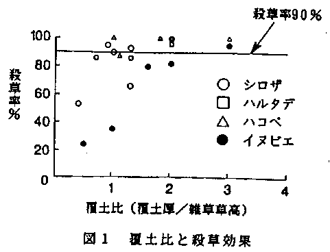 (1)覆土による殺草効果は,(覆土厚さ/雑草草高)で示される覆土比か広葉雑草で2以上,ヒエでは3以上必要であった(図1)。