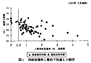 (3)一方F−3以下では、いずれの葉位もうどんこ病の発生と1粒重との間に関係は再られなった(表1)。