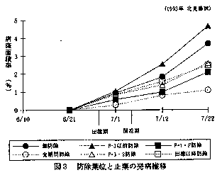 ①F−3葉以前の早期に薬剤防除を行った場合、止葉展開期頃までの発病は少く抑えられるが、その後の防除を行わないと、出穂期以降のF−1葉および止葉の発病は無防除よりもむしろ多くなる傾向にある。
