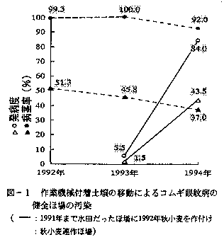 (3)本病の重要な伝染源は罹病変稈であり、汚染土壌や罹病麦稈のわずかな移動によってもほ場に容易に侵入、定着するため、健全ほ場は容易に汚染ほ場となる(図−1)。複数のほ場を共通の機械で作業する際は、可能な範囲で多発ほ場の作業を後にする。