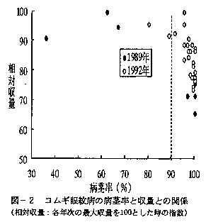 本病は、病茎率90%、発病度40(糊熟期)を越えると、病斑が茎を完全に取り囲む病室が発生するため、減収と品質低下が生じ、小麦も倒伏しやすくなる。しかし、病茎率90%、発病度40以下であれば被害はない(図−2)。