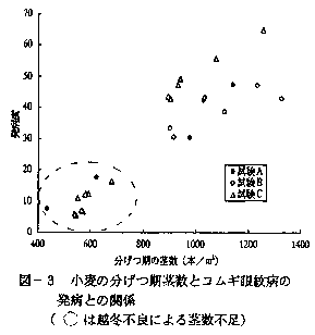 (2)は種時期が早いほどは種量が多いほど本病の発病は増加したが、これは茎数過剰が発病を助長するためと考えられた(図−3)。また、起生期の過剰な追肥は被害を助長した。したがって、本病の発病を助長させないためには、極端な早期は種や過剰は種を避け、茎数に応じた適正な分追肥によって、茎数過剰にならないように栽培管理を行う必要がある。