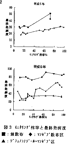 (3)連作圃場では本病の初発が著しく早く、発病も急激に進展する場合が多いので、適用は難しい。