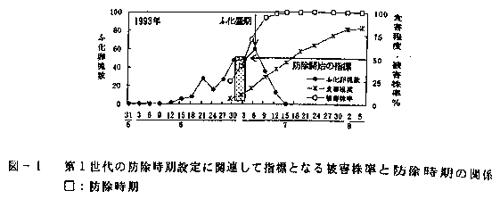 (4)被害株率50%の時点の食害程度が被害許容水準以下であったことから、この時点から防除を行った場合、以降の被害を被害許容水準以下に抑制できると考えられた。この防除時期はふ化最盛期にほぼ該当し、幼虫も大部分が若令期であった。また、この時期は慣行2回防除の第2回に相当するため、防除回数は1回削減できると考えられた。