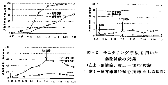 (6)被害株率が30%および50%時点での1回散布の効果は慣行の2回散布と同等であり、しかも散布回数を1回削減できる有効な防除法と認められた。