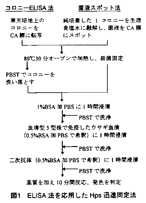 4)ELISA法を応用したHpsの迅速同定法について検討し、純培養した菌株により調製した菌液をセルロースアセテート膜にスポットし(菌液スポット法)、血清型5または6型株で免疫したウサギ血清を一次血清に用いることにより、血清型1〜6型の野外Hpsを効率よく検出・同定できることを明らかにした(図1)。