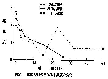 (3)菌群堆肥区の発熱および悪臭の低減は慣行堆肥区に比べてすみやかであったが、少量調製時に比べて大量調製時における処理間差は小さくなる傾向にあった(図2)。