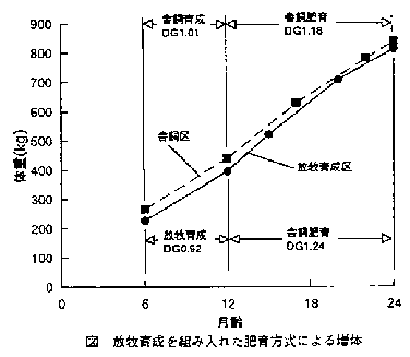 2)放牧育成区の舎飼肥育期のDGは1.24㎏で、舎飼区より高く、飼養期間を通してのDGは舎飼区とほとんど変わらなかった(表1、図)。