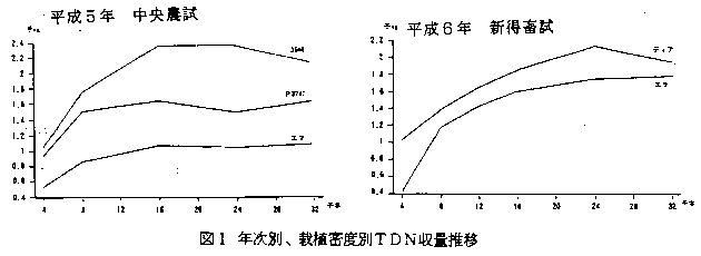 | 処理 | 密度 | 収穫日 | DCP | TDN | TDN収量 | 比 | 収穫日 | DCP | TDN | TDN収量 | 比 |