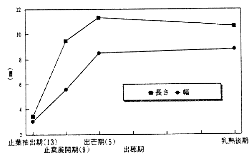 3)外穎は止葉抽出期(出穂期2週間前頃)から出芒期にかけて急激に発育し、外穎の長さと幅はこの時期にほぼ決定される。
