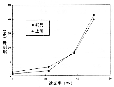 図2 遮光率と側面裂皮粒発生率