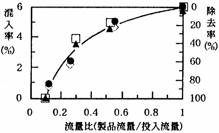 図4 流量比と凸腹・側面裂皮粒の混入率及び除去率