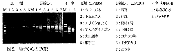 5)本法の応用例として、RAPD(random amplified polymorphicDNA)マーカーによる大豆の交雑種子の判定を行った。両親間の多型により、交雑の正否の判定が河能であった。