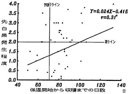 第1図 保温開始から収穫までの日数と先白果発生程度の関係