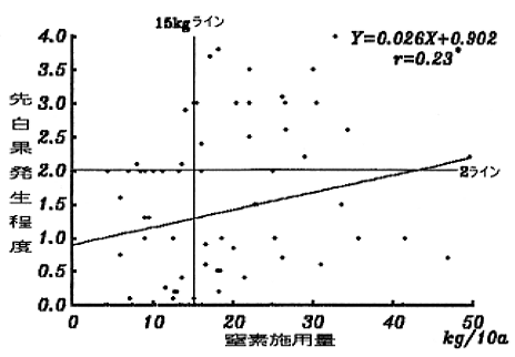 (2)窒素施用量については、15㎏/10a未満では先白果の発生程度が2以上になるものが少なかった。