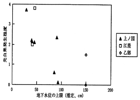 第3図 地下水位の上限(推定cm)と先白果発生程度との関係