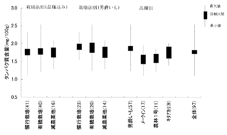 2)品種(男爵いも)を同一にして栽培決別に比較すると、その平均値はでん粉価(慣行栽培:14.8%、有機栽培:14.5)、乾物率(慣行、有機とも:22.0%)、ビタミンC含量(慣行:15.7mg/100g、有機:18.2)、タンパク質含量(慣行:1.91mg/100g、有機:1.88)、遊離アミノ酸含量(慣行:748㎎/100g、有機:705)であった。なお、両者の平均値間には、いずれの項目とも有意差は認められなかった。