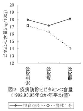 5)品種の疫病抵抗性と品質の関係により、ビタミンC含量は抵抗性のない農林1号では低下したが、抵抗性のある系統である根育29号では、防除の有無による有意差は見られなかった(図2)。