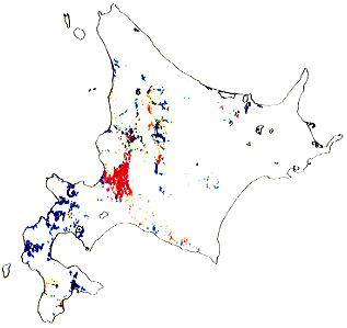 (1)粘土流出地帯分類図の作成:簡易測定装置で測定した吸光度(懸濁度)を粘土沈降性の指標として3区分し、国土数値情報の土地利用区分より抽出した水田を含む3次メッシュに懸濁度値を対応させ粘土流出地帯分類図を作成した。