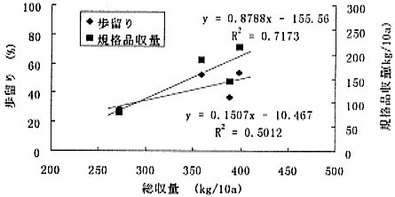 | 試験番号 | 1 | 2 | 3 | 4 | 5 | 6 | 7 | 合計 | 収量 | 規格品 割合 (%) |