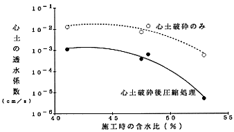 ④心土の透水係数は、含水比の高い時期に心土破砕を施工しても圧縮が加わることにより10−3から10−1に透水性が低下した(図2)。また、圃場造成時の適正な水分条件はpF3.0程度(含水比で細粒質土壌34%、中粗粒質土壌45%)であった。