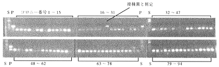 ABsp1・ABsp2で反応、S:サイズマーカー、P:胞子懸濁液からのコロニーによる陽性対照区
