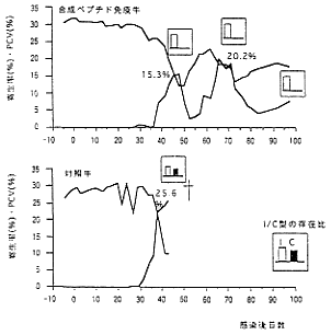 (3)−2)子牛にC型由来合成ペプチドワクチンを接種した後、CおよびI型混在のTsを人工感染させたところ、I型Tsが終始優位に推移し、C型Tsの出現が抑制された(図1)。また、本病発生牧野への放牧による同ワクチンの効果試験において、ペプチドAに対する抗体価の上昇が確認され、Ts寄生率の上昇をやや抑制する効果が認められた(図2)。