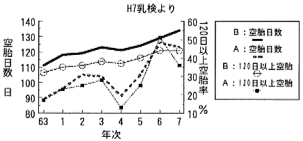 フリーストール化に伴い一時的に個体乳量が低下することがあり、移行前の乳量水準が低い場合に多い。これは新しい技術を習得するには時間がかかることを示している。また、移行に伴い乳牛の増殖に期間を要すること(表1)や繁殖の悪化や疾病の発生などが問題となっている(図2)。フリーストール化した場合には飼養環境に合わない乳牛や疾病のため、高い産次数の乳牛を中心に淘汰されるので平均産次数が低下していく(2.9産→2.6産)。