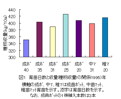 収量性(種籾収量=籾重×登熟歩合(塩水比重1.10))は、成苗ポット40日育苗で低く、20〜35日育苗では収量性に差はなかった(図1)。また、播種粒数間の差もなかった。