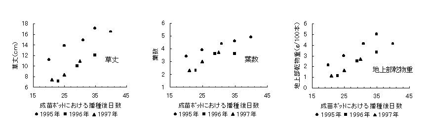 以上から、水稲原種栽培管理基準(平成6年4月8日付 農流第64号)中、「極早生種の育苗日数は、播種量を増し20〜25日程度に止める。」を「極早生種の成苗ポット育苗での育苗日数は、25日程度とする。このときの苗形質は草丈10cm、葉数3葉、地上部乾物重2g/100本程度を目安とする。」に改訂する。