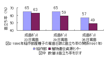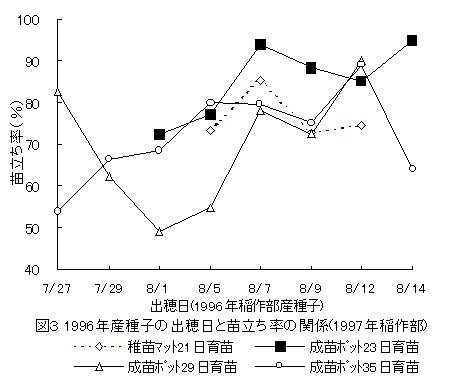 成苗ポット25(23)日育苗で高い苗立ち率が得られた要因は穂揃性が比較的良いために、過熟による種子活性の低下が小さいためと推察される(図3)。