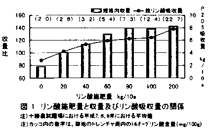 3)リン酸肥沃度の低い十勝農試圃場では、施肥リン酸による増収効果が顕著であり、高収量を得るためには、80kg/1Oa程度のリン酸が必要であったが、これ以上の施肥量では増収効果は頭打ちとなった(図1)。