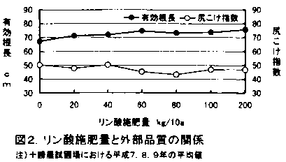 4)リン酸を増肥することにより、根の生育が促進され収量は高まるが、根長や尻こけ指数にはほとんど影響はなかった(図2)。