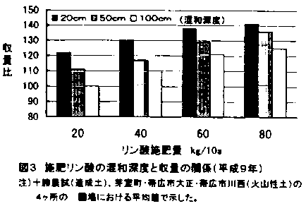 6)現在の慣行法であるトレンチャ港内の肥料混和深度100㎝に対して、表層20㎝までに肥料を浅く混和することにより、火山性土であっても、60〜80㎏/10a必要であったリン酸施肥量を20kg/10aまで減肥することが可能であった(図3)。