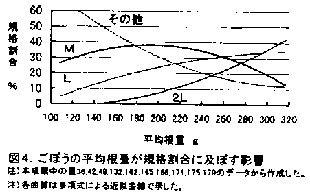 12)ごぼうの平均根重と規格割合の関係を示す図によると、晩春まきにおいて、収益性の高い「M」を中心とした規格構成にするためには、目標根重を200〜220gとするのが適当であった(図4)。