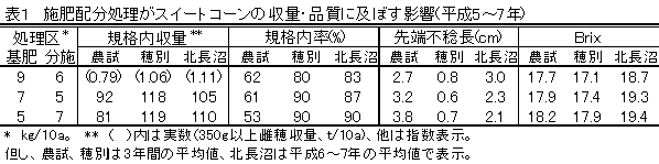 1)本成績は生食用スイートコーンを用いた露地直播作型の条施栽培における窒素施肥法である。