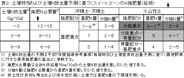 6)更に、土壌別の施肥配分と土壌窒素肥沃度を組み合わせた効果的窒素施肥法は、土壌N放出量を3水準に区分して、表2に示した。