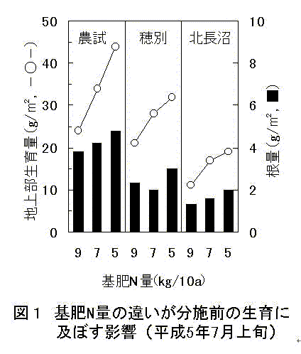 3)施肥Nの拡散が小さい沖積土・洪積土では基肥N量が多いほど規格内収量および規格内率が高いが、拡散が大きい火山性土では基肥N量を少なくし、分施Nに重点をおいた方がその収量性、品質が高まった(表1)。