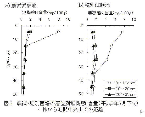 4)スイートコーンの最大生長期における根の分布は施肥Nの動態(図2)と良く一致し、その範囲は沖積土・洪積土で狭く、火山性土で広かった。