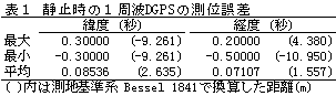 (2)1周波受信のGPSでは、静止時単独測位の最大と最小の差は緯度で約7秒、経度で約3.5秒である。DGPSでの測位誤差は緯度で平均0.08536秒(2.64m)、経度では平均0.07107秒(1.56m)と単独測位より大幅に測位精度が向上する。