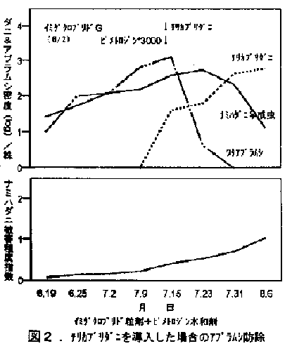 ②オレイン酸ナトリウム液剤は、チリカブリダニとナミハダニに対して活性が認められるので、チリカブリダニを導入する場合は、直接散布液がかからないような時間的な隔離が必要である。ただし、隔離の時間はわずかで良いと思われる。ワタアブラムシに対しては防除効果が認められるものの、残効が短いという欠点があることから、発生初期の低密度時期に使用するのが良いと思われる。