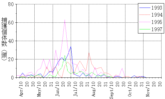 ③ 成虫捕獲消長:落とし穴式トラップによるマルガタゴミムシ成虫の捕獲はじめは4月上旬で、5月中旬から捕獲数が増加し、7月中旬以後減少する(図1)。新成虫は6月後半から捕獲され、大部分は雑草地で捕獲されており、畑地では少なかった。