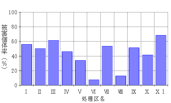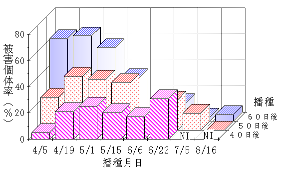 ① 渡島中部地方におけるトンネル栽培だいこんの6月収穫調査では被害個体率が60%前後と高かったのに対して、道央部や道東部における共選場での7月調査では同11−26%と比較的低く、被害はトンネル栽培だいこんで大きかった。