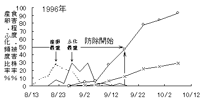 第1図 第2世代の被害推移と防除開始時期の指標となる被害株率50%(1996)