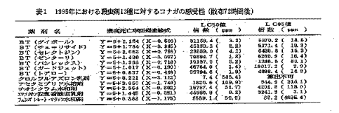 表1 1995年における殺虫剤12種に対するコナガの感受性(散布72時間後)