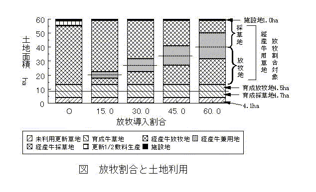 放牧導入割合は経産牛用の草地を対象とした放牧地と兼用地1/2の草地に占める面積割合とした(図)。放牧導入割合(以下放牧割合とする)は0、15、30、45、60%の5水準とした。