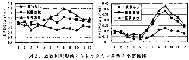 4-1)バルク乳(17戸)のビタミンE含量は放牧なし、制限放牧、昼夜放牧で0.68、0.87、1.04μg/ml、βカロチン含量は0.20、0.33、0.37μg/mlと放牧利用で2倍近くに高まった(図2)。