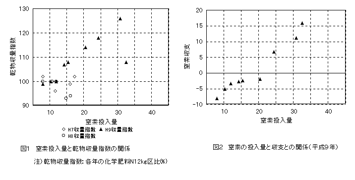 4)全投入窒素量30kg/10aまでは窒素施用によって直線的に収量は増えたが、25kg/10aを越えると施用窒素量が吸収量を上回った(図1、2)。